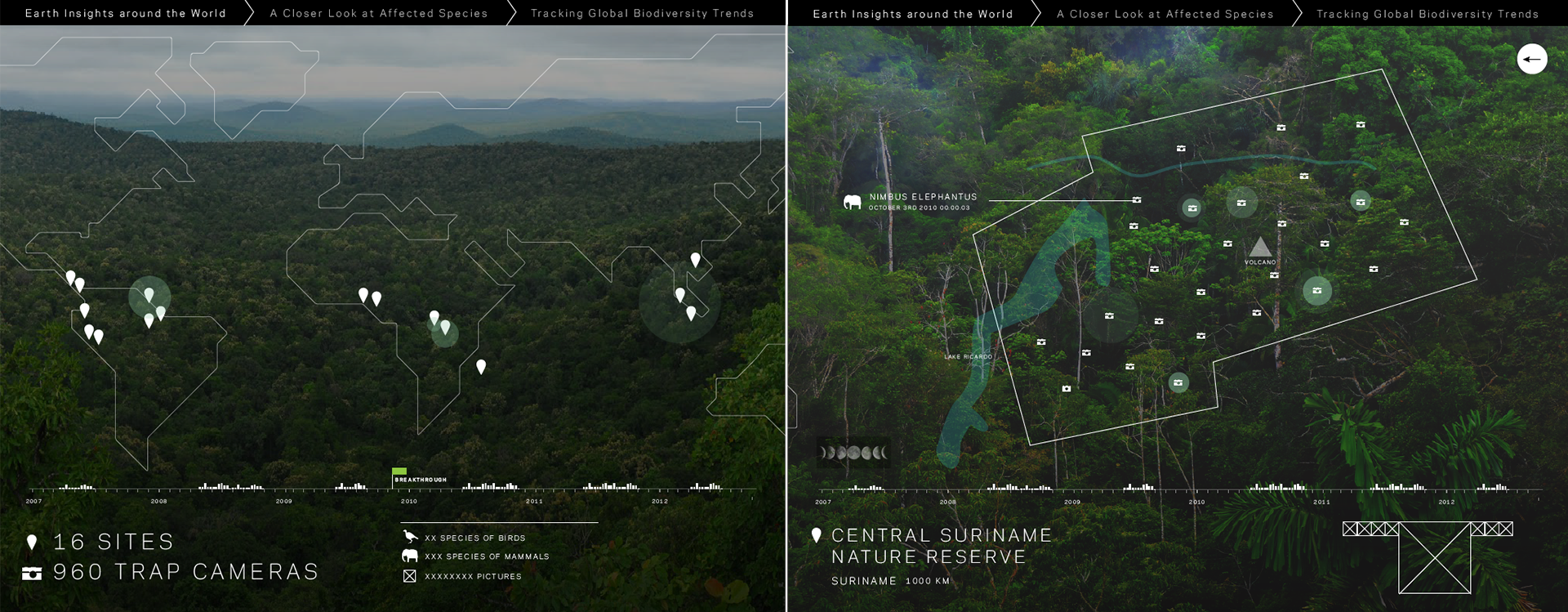 Meanwhile, Audrée, Creative Director and co-founder, and I reworked the charts with a graphical language that was coherent with the global design approach. The experience was structured to guide the user from a big picture overview to granular data insights. To this end, I developed three environments that could tell different parts of the story. Each of these environment housed different key findings pertinent to the project’s goal to demonstrate biodiversity loss.