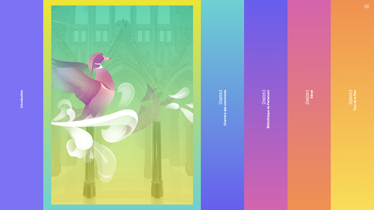 L’expérience fut adaptée pour les plateformes web afin d’offrir une version accessible de l’expérience. J’ai conçu une interface simple et intuitive à naviguer, et avec l’aide de Stéphane Poirier, nous avons collaboré à illustrer les scènes en s’inspirant de la direction artistique de l’expérience en réalité virtuelle. Deux ans de travail se concluent en une expérience bilingue mise en œuvre pour le casque Quest et le web. Le tout dissimulé à travers le Canada pour une expérience en salle de cours et chez soi.